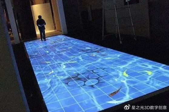 地面互動一般是以地面為載體,地面上設置互動感應屏、感應磚,把設置好的投射光線投射到地面,產生互動效果,主要是利用人的雙腿,在地面上形成互動,產生獨特的互動效果。
